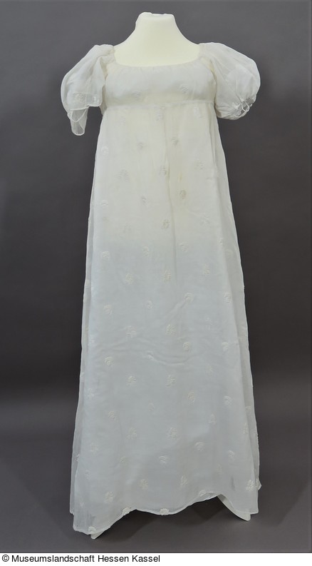 Das Oberteil ist auf Figur gearbeitet und reicht bis knapp unter die Brust. In der Ausschnittkante ist, wie auch im Saum der kurzen, sehr weiten Ärmel ein Zugband eingezogen. Die Ärmel bilden, auf Armstärke zusammengezogen, Puffärmel.