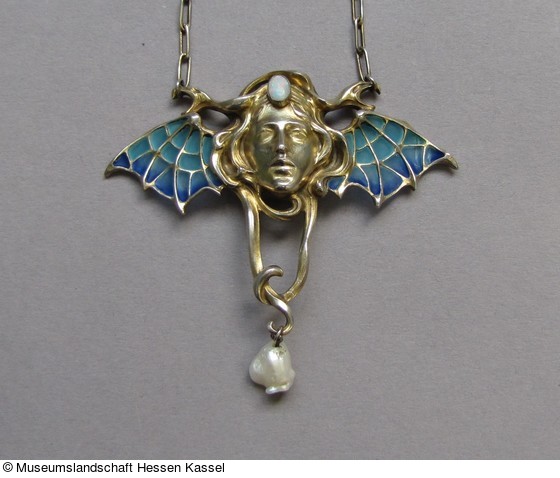 Schmuckanhänger mit Kette in Gestalt eines Frauenkopfes mit zwei Flügeln