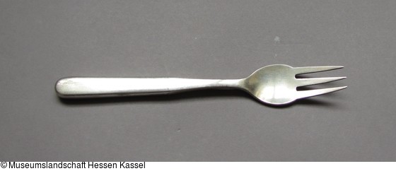Die dreizinkige Gabel gehört zum mit Süßspeiselöffel (KP 1966/29b) und Messer (KP 1966/29c) zum Dessertbesteck der Modellserie III.