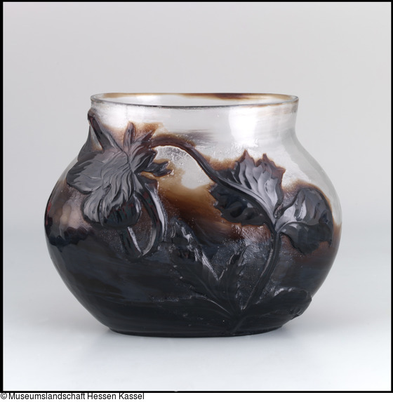 Signatur: "Gallé en sa christallerie à Nancy" Modèle et décor déposés ("Gallé en sa christallerie à Nancy", mit Blattzweig (Reliefätzung), Modèle et décor déposés (Nadelätzung));