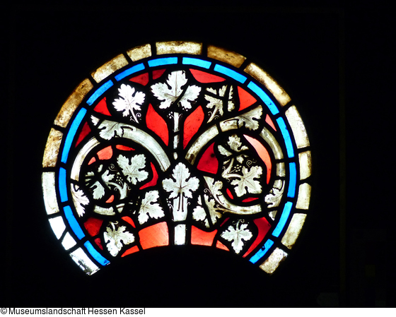 Die Scheibe stammt aus der Stiftskirche in Wetter, einem der frühesten Nachfolgebauten der Marburger Elisabethkirche. Dort war sie einst in gotisches Maßwerk eingesetzt und könnte zu einem der Langhausfenster gehört haben. Das Ornament ist als sich einrollende Weinranke gestaltet.