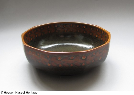 Steingut, Glasur in Blau, Braun und Gelbbraun. |