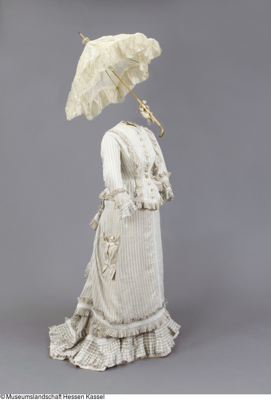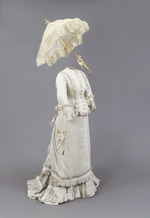 Weißer Sonnenschirm mit Rüschen und Spitzenbesatz, vergoldete Krücke mit Hammerschlag
