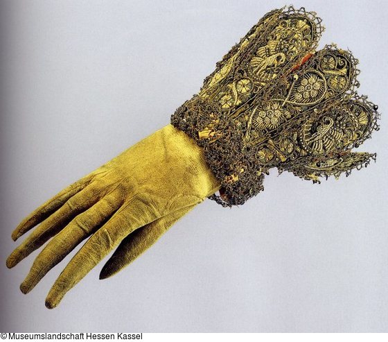 Ob sich Brauthandschuhe generell von den anderen, prunkvollen Vertretern dieser Gattung, die zu offiziellen Anlässen getragen wurden, unterscheiden, läßt sich bislang nicht nachweisen. Allein die Bilddarstellungen auf den kostbaren Stulpen lassen diese Vermutung zu. Traditionell wurde bei Verlöbnissen, die in offizieller Art und Weise in Gegenwart eines Großteils der Familie begangen wurde, Treuepfänder ausgetauscht, zu denen meist auch prunkvolle Handschuhe für die Braut gehört haben. Die Perlstickerei des Kasseler Handschuhs ist von hoher Qualität. Das auffälligste Motiv sind Pelikane, die sich die Brust aufpicken – ein Symbol für sich aufopfernde Nächstenliebe.
