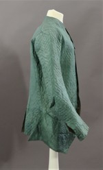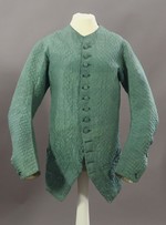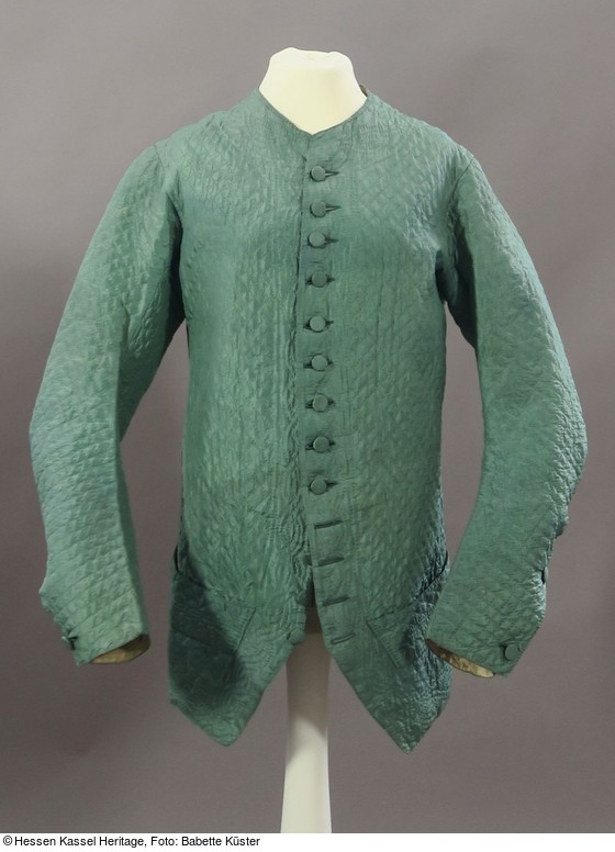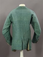 Die Jacke ist kragenlos, schließt aber eng am Hals an. Der grüne Seidentaft ist über einer Watteeinlage in einem einfachen Rautenmuster gesteppt, das am Halsausschnitt und den beiden Vorderkanten von einem Flechtband als Randornament begrenzt wird.