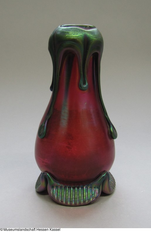 Weinrotes Glas, irisierend, angeschmolzene grün irisierende Reliefauflage sowie Mündung und Sockel |