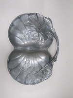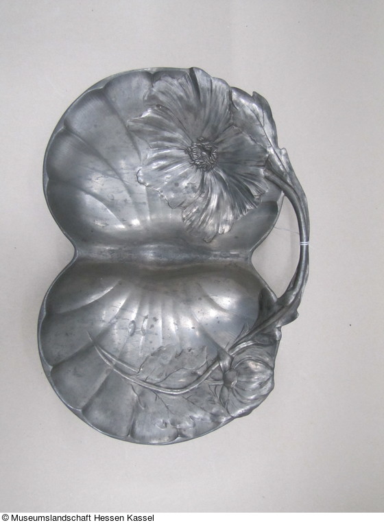 Doppelschale als aufgeklappte Muschel mit Mohnblütenrelief, Stengel als Handhabe und vier Kugelfüßen (Nr. 4216)