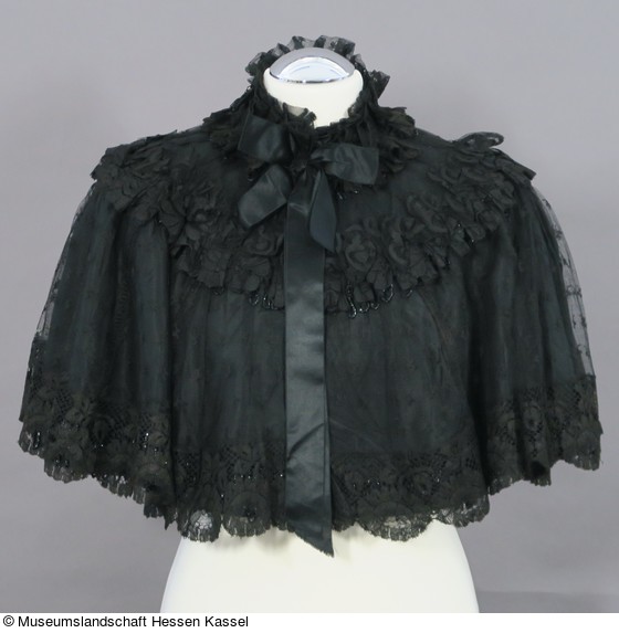 Über dem Taft liegt schwarze Spitze, die durch eine Rüsche aus schwarzer Bandspitze auf der Schulterlinie mit dem Taft verbunden ist. Unter dieser Rüsche sind ebenfalls Perlfransen befestigt. Auch der Stehkragen ist auf die gleiche weise garniert. Auf der rechten Seite ist eine große Atlasschleife mit bis zum Saum reichenden Bändern am Kragenansatz aufgesetzt. Sie verdeckt den Verschluss der Pelerine: 6 Paare Haken und Ösen, die vom Kragen bis zur Schulterlinie reichen.