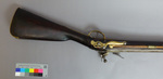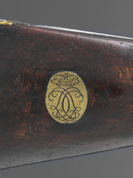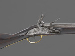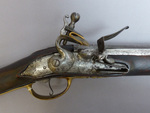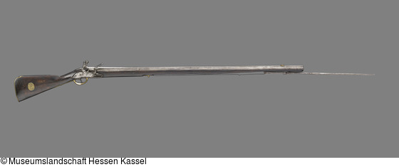 Die Steinschloßmuskete ist dank der in den Kolben eingelassenen Messingplatte mit dem bekrönten Spiegelmonogramm "LC" eindeutig als Waffe aus der Zeit Landgraf Carls zu identifizieren. Musketen gehörten zur Ausrüstung der hessischen Infanterieregimenter. Bemerkenswert ist das ausklappbare Bajonett, das unterhalb des Laufs angebracht ist und wohl eine Seltenheit darstellt (Kat. Kassel 2018, S. 222f.).