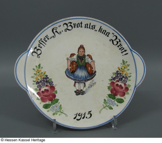 Signatur: Joh. Ge (?) Mohr (Joh. Ge (?) Mohr, rechts und links Wächtersbacher Rose); Wächersbach, gesetzlich geschützt, Dek. 2520, 20 (Marke: Blauer Druckstempel Schild mit Krone und Umschrift: Wächersbach, gesetzlich geschützt (im Rechteck), Dek. 2520, 20); C2B4781/I WÄCHTERSBACH 1915 (Pressmarke (Schild));