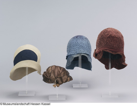 Mattblauer Damenhut, helmförmige Kappe, vollständig mit dunkelblauem Seidenwappen bestickt, leicht abstehende Krempe (abgetrennt) |